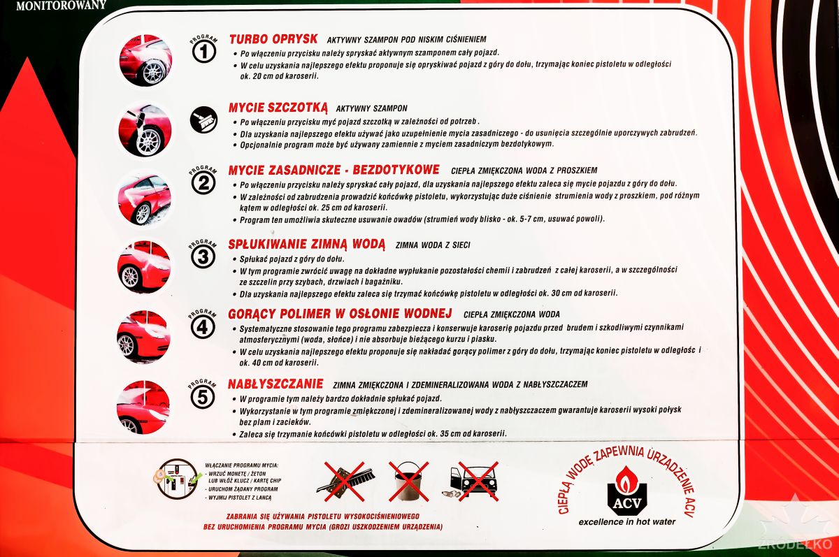 Instrukcja znajduje się na jednym ze zdjęć oraz widoczna jest przy każdym ze stanowisk myjni.